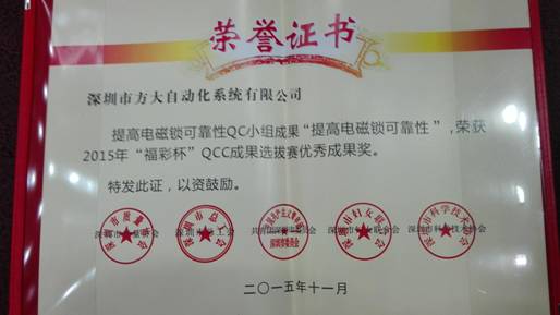 11月20日,由深圳市質(zhì)量協(xié)會、深圳市總工會、共青團(tuán)深圳市委員會、深圳市婦女聯(lián)合會和深圳市科技技術(shù)協(xié)會聯(lián)合評定的“福彩杯”優(yōu)秀QCC成果優(yōu)秀獎揭曉。方大集團(tuán)股份有限公司全資子公司深圳市方大自動化系統(tǒng)有限公司“提高電磁鎖可靠性QC小組”榮獲“深圳市2015年‘福彩杯’QCC成果選拔賽優(yōu)秀獎”,自動化公司質(zhì)量安全部黃良江榮獲“深圳市質(zhì)量管理小組活動卓越領(lǐng)導(dǎo)者”稱號。