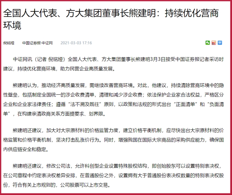 全國人大代表、方大集團董事長熊建明3月3日接受中國證券報記者采訪時建議,持續優化營商環境,助力民營企業高質量發展。