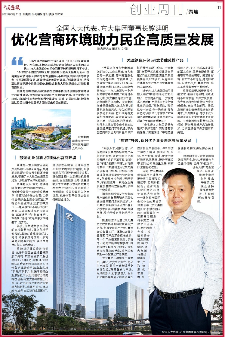 2021年全國兩會于3月4日-11日在北京隆重舉行。兩會前,本報記者對即將進京參加兩會的全國人大代表、方大集團股份有限公司董事長熊建明進行了專訪。